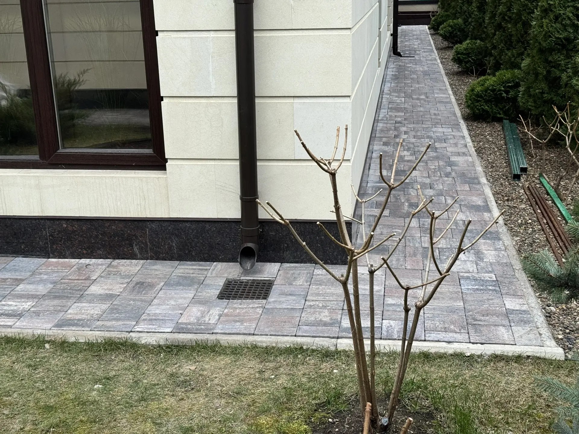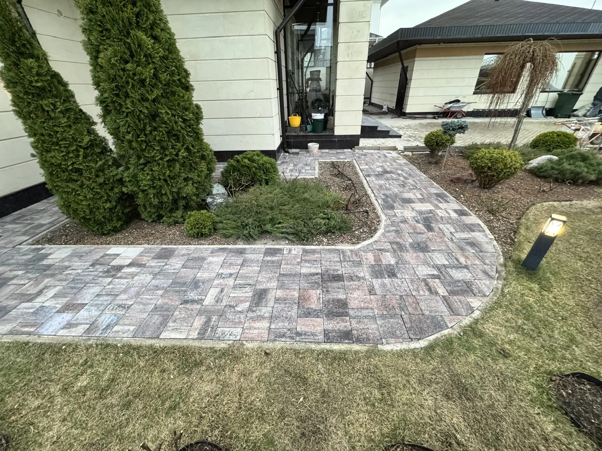 Для мощения придомовой территории большой площади (350 м²) заказчик выбрал тротуарную плитку серии «Колормикс», форма «Новый город», цвет «Умбра» — это насыщенный коричневый с прожилками чёрного и белого, имитирующий фактуру природного камня.