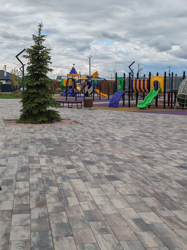 Площадь заиграла новыми красками благодаря плитке цвета "Умбра", которая гармонично вписывается в ландшафт, создавая идеальное сочетание с зеленым газоном, насаждениями, лавочками и детской площадкой. СПА-зона с бассейном стала еще более привлекательной и уютной, а плитка добавила современности и стиля в общий дизайн.