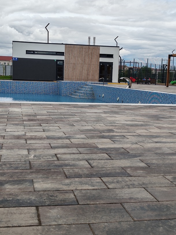 Площадь заиграла новыми красками благодаря плитке цвета "Умбра", которая гармонично вписывается в ландшафт, создавая идеальное сочетание с зеленым газоном, насаждениями, лавочками и детской площадкой. СПА-зона с бассейном стала еще более привлекательной и уютной, а плитка добавила современности и стиля в общий дизайн.